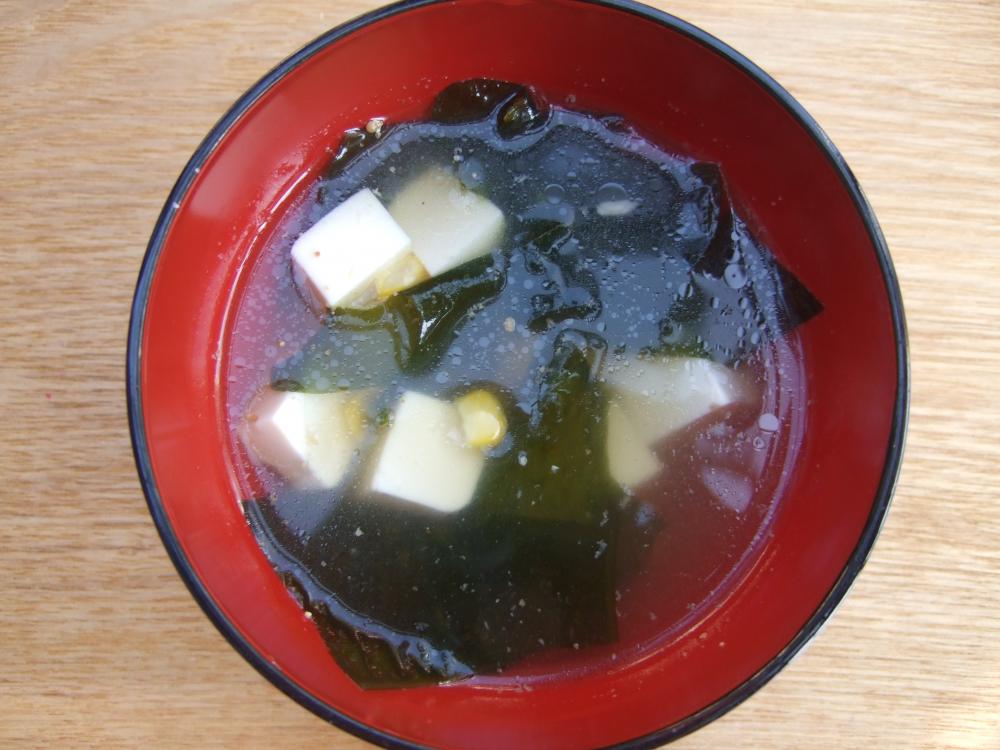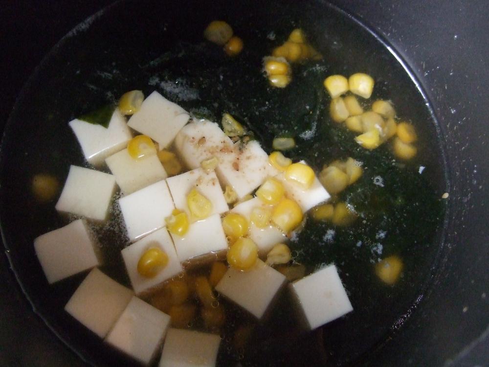 ![]() 鶏がらスープを沸かし、わかめ、豆腐、コーンを入れ、Aで味付けする。
