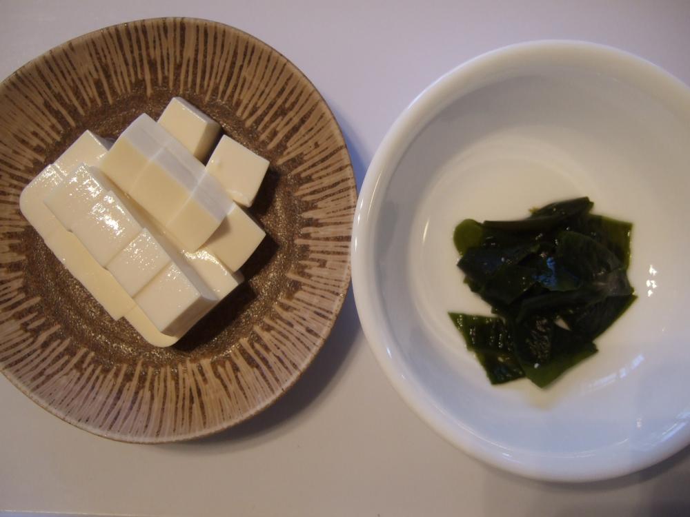 ![]() 塩蔵わかめはしっかり洗い水さらし。硬い筋を取り、適当な大きさに切る。豆腐は1cmの角切りにする。