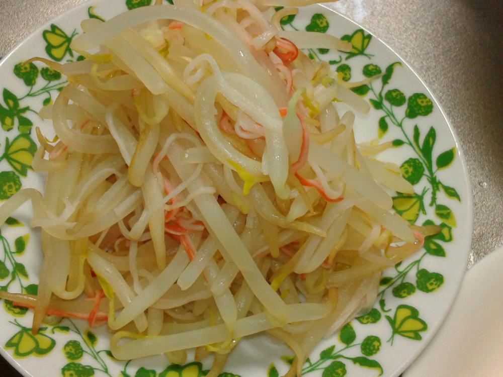 フライパンにサラダ油を熱し、もやしとカニカマを入れて炒めます。