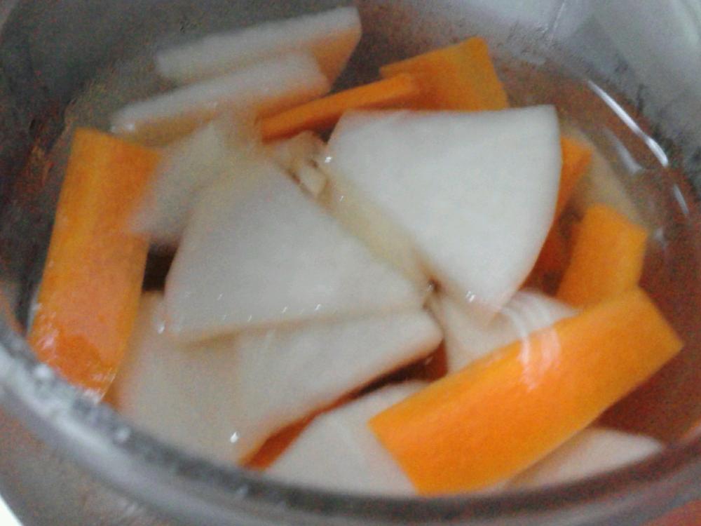 すし酢をかけます。大根とにんじんが漬かるようにします。