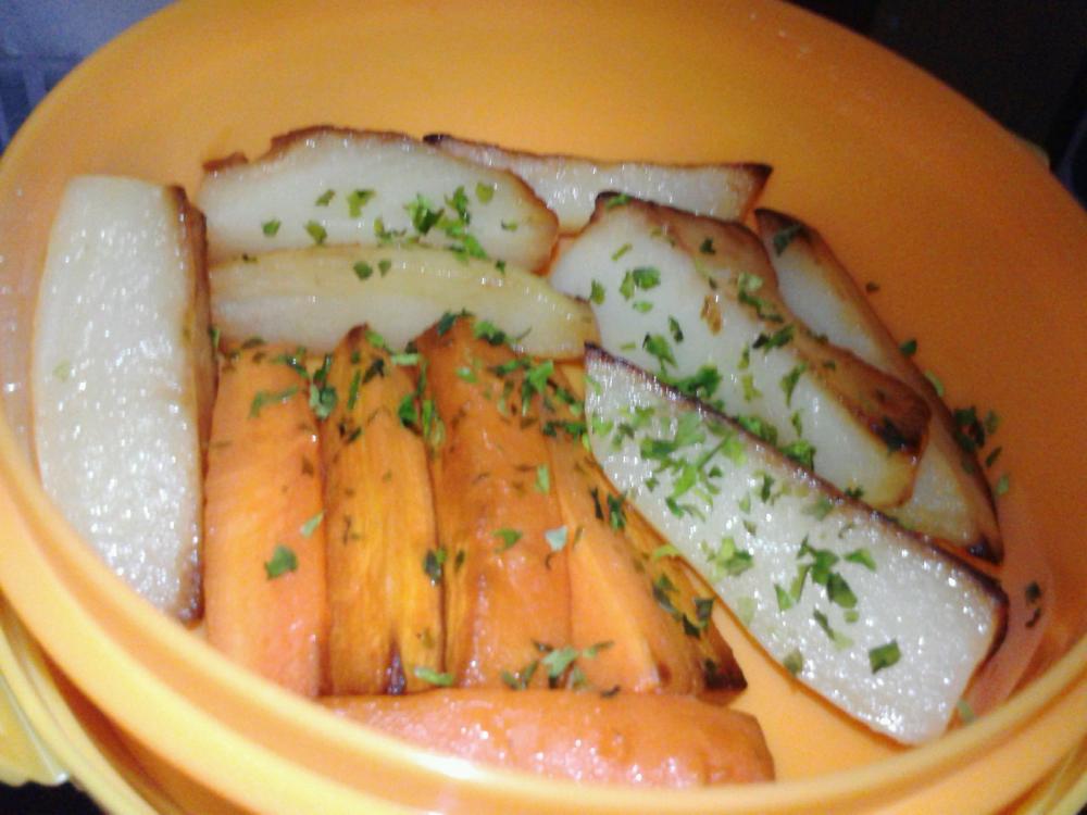 フライパンにごま油を熱し、にんじんとじゃがいもを揚げ焼きにします。