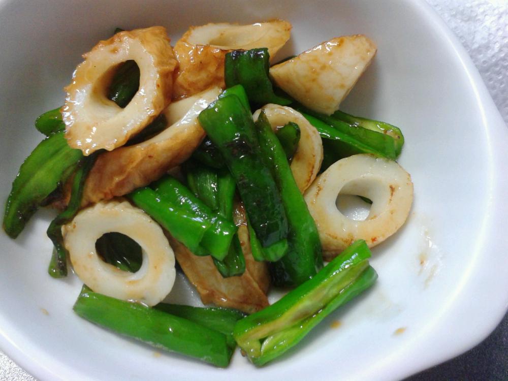 フライパンにサラダ油を熱し、ししとう・ちくわを炒めます。