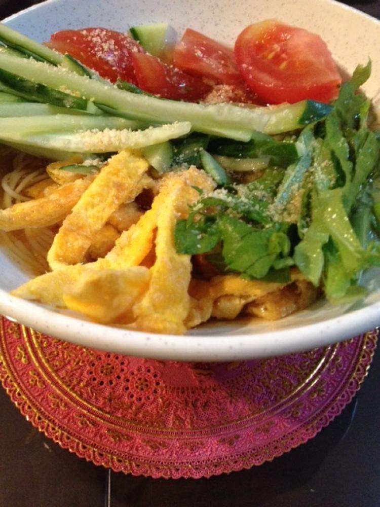 レモン果汁、お酢、ごま油を入れためんつゆにそうめんをよく絡めたら、器に盛り野菜類を飾る。完成!