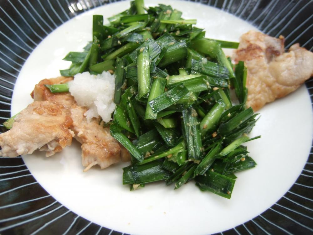豚肉、大根おろし、ニラナムルを盛り付ける。