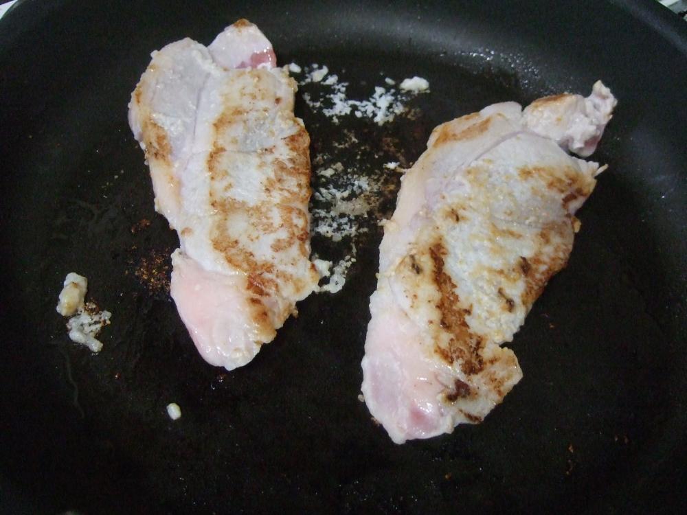 ![]() フライパンにサラダ油を熱し、豚肉を焼く。強火で両面焼き色をつけ、弱火で料理酒を加え蓋をし、火を通す。