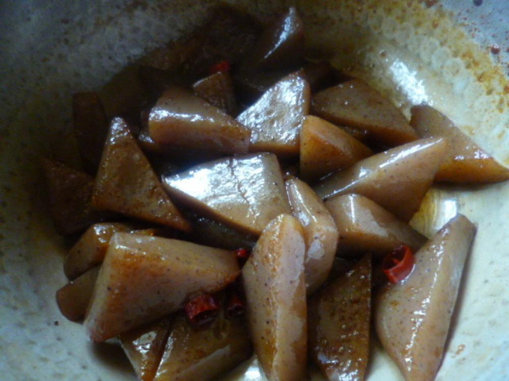 こんにゃく 醤油 ラカントをなべ煮れて中火で汁気がなくなるまで煮る