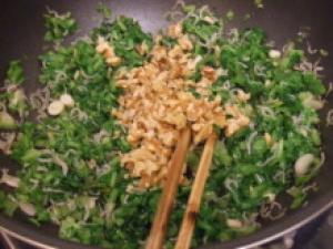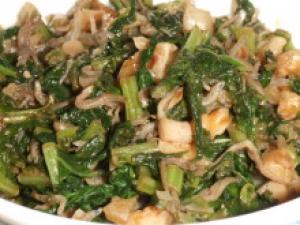 ![]() フライパンにごま油を熱し、ちりめんじゃこ・大根の葉を入れ、しんなりするまで炒め、くるみ、しょうゆ・みりんを加え炒める。