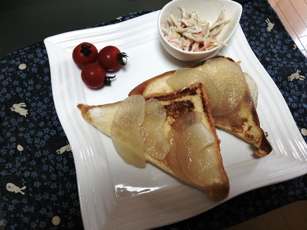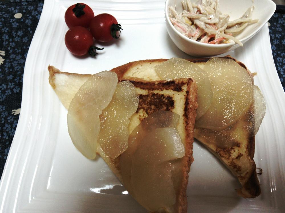 ![]() フライパンで焼いて、梨のコンポートをのせる。お好みでメープルシロップをかける。
