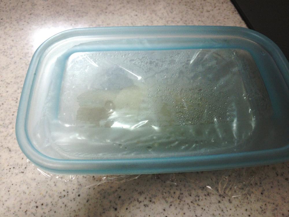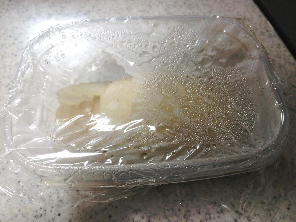 ![]() 梨は皮と芯をとって、スライスして、ラカントS顆粒をふりかけて、ラップをしてレンジで3分加熱する。