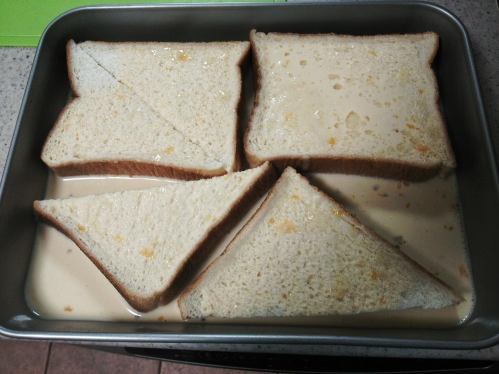 ![]() 食パンにあわせたAをつけて、冷蔵庫で一晩置く。