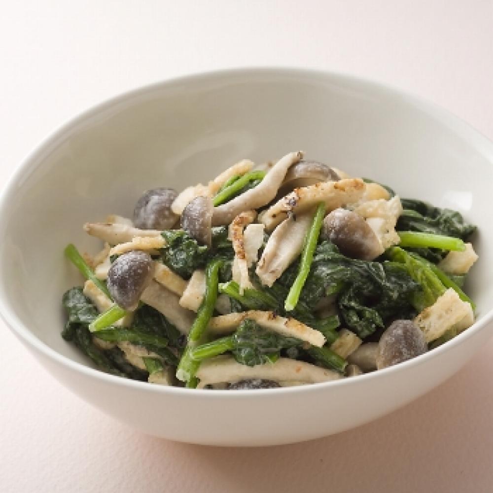 鍋にごま油を引き、ほうれん草ときのこ類をさっといためます。