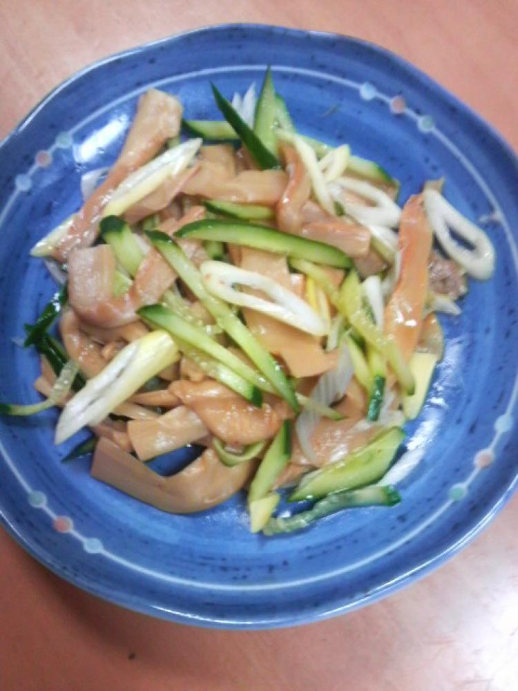 きゅうりは千切り、長ねぎは斜めの薄切りにする。