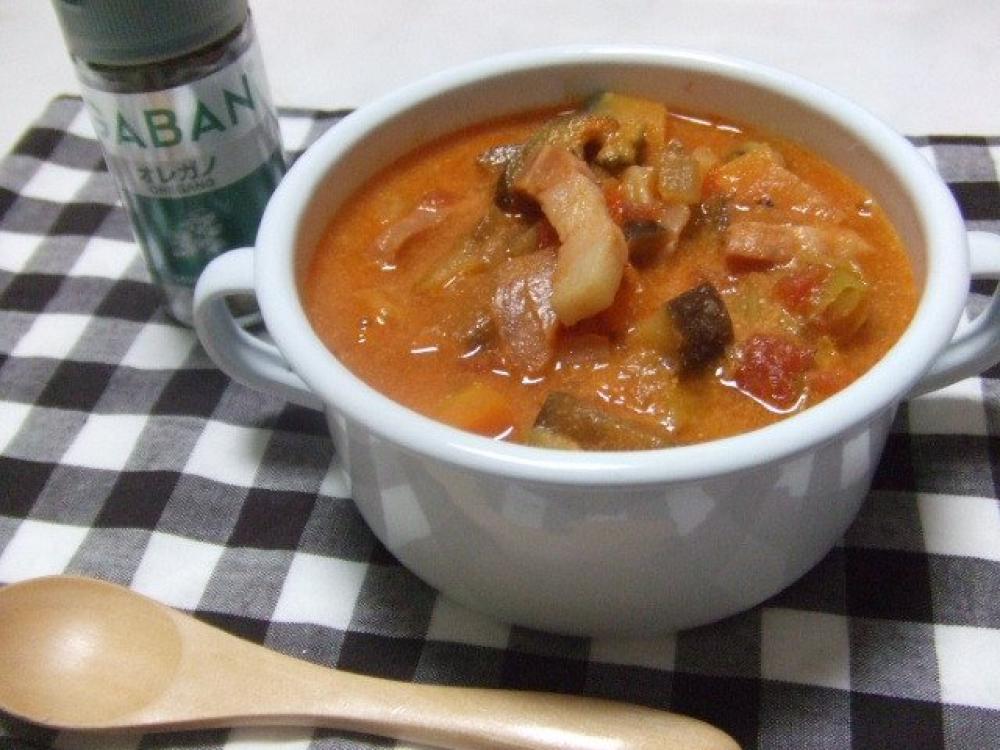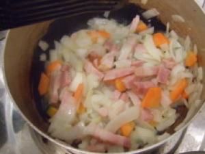![]() 鍋にオリーブオイルを熱し、にんにくを炒め、香りが出たら取り出し、ベーコンと玉ねぎを入れ炒める。