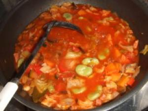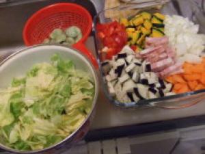 ![]() 野菜とベーコンは食べやすい大きさに切る。にんにくは中の芽を取って薄切り。空豆はあらかじめ塩茹でする。