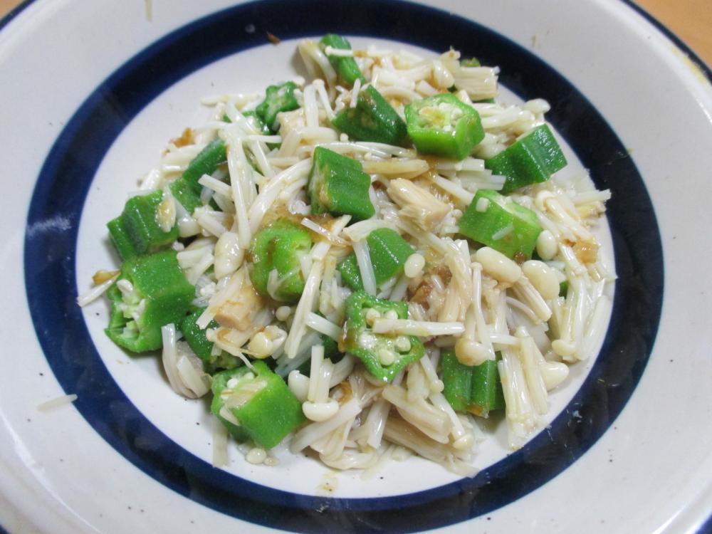 えのきとオクラをビニール袋に入れて1~2分レンジにかけ、冷めたら小さく切る。