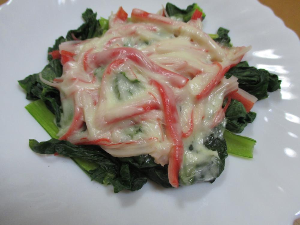 小松菜と裂いたカニカマを耐熱皿に盛り、とろけるチーズを乗せてレンジで2分加熱する。