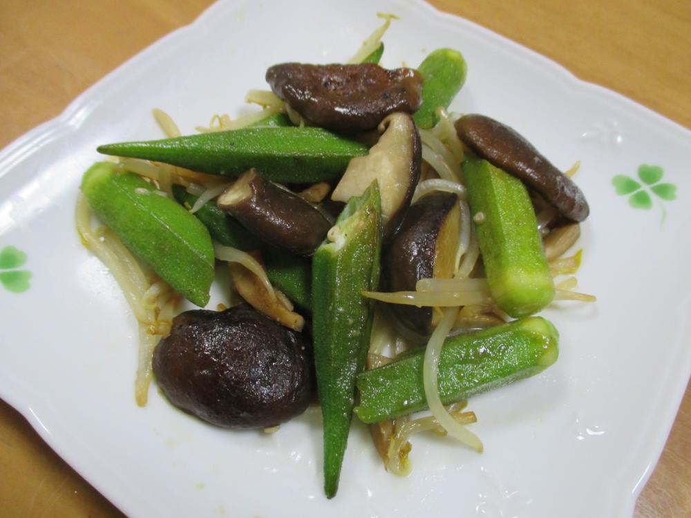 フライパンにオリーブオイル少々を熱し、椎茸とオクラを軽く炒めたら蓋をして2分ほど蒸し焼きにする。