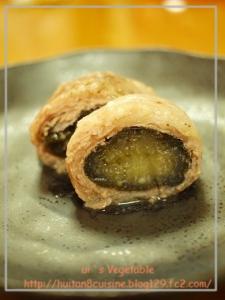 ナス1本に豚肉を巻きつけていく。※隙間が開かないように、なるべく厚くなるように巻く!