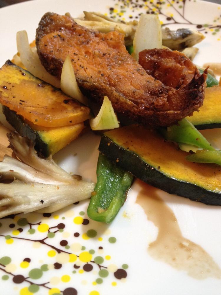 野菜を半量のバターと半量の醤油で炒め、火が通ったらお皿に盛りつけておく。