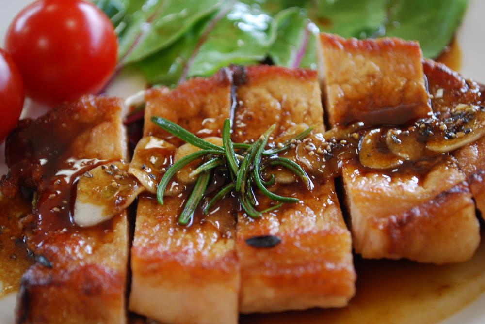 フライパンにオリーブオイルを入れ、豚ロースを焼く。
