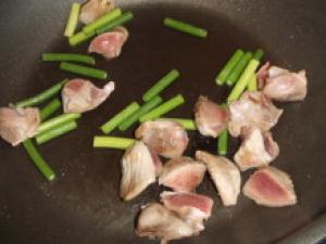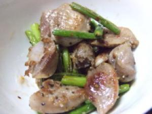 ![]() フライパンに油を熱し、砂ずりを炒め、色が変わったらニンニクの芽を加え、さらに炒める。