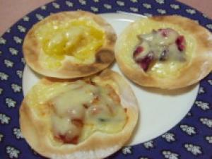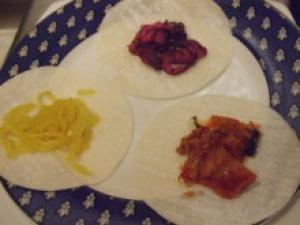 ![]() 餃子の皮に、細かく切ったしば漬け・たくあんと、キムチをそれぞれのせる。