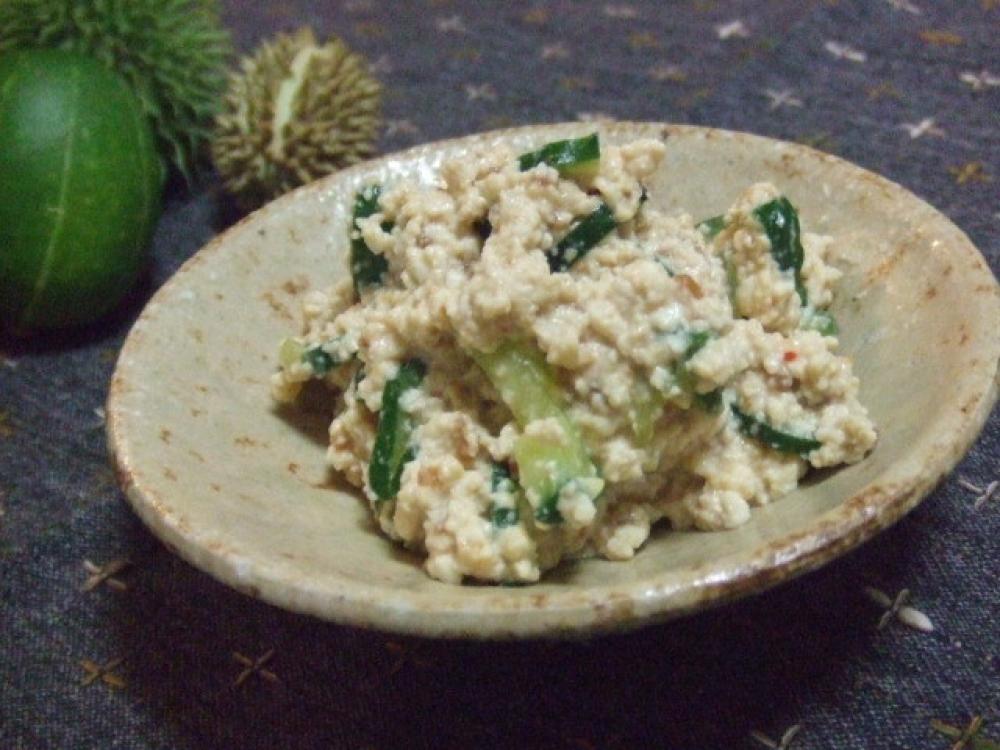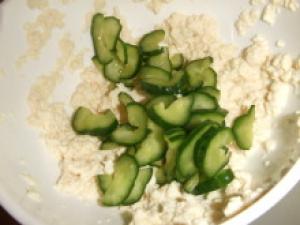 ![]() きゅうりは薄切りに、塩もみして、(1.)と具のソース、練りゴマと和え、味を見ながら塩を入れる。