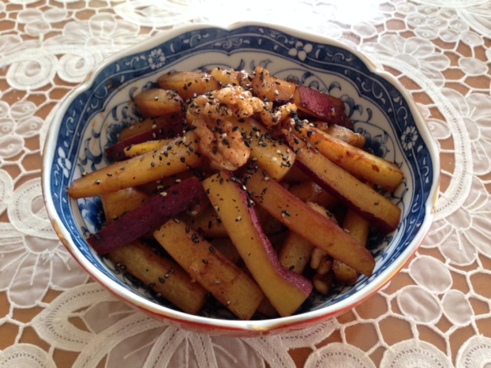 サツマイモは幅1㎝厚さ5㎜程の短冊切りにし、油を熱したフライパンで炒める。
