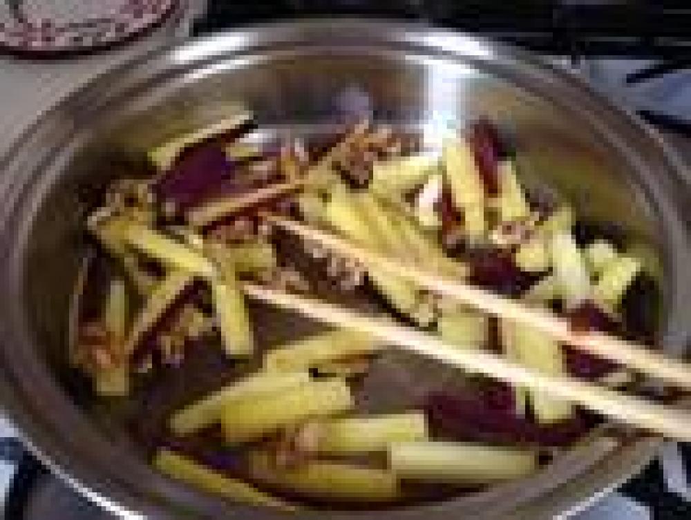 ![]() サツマイモに油がなじみ黄色くなってきたら、粗くつぶしたクルミを加え炒める。