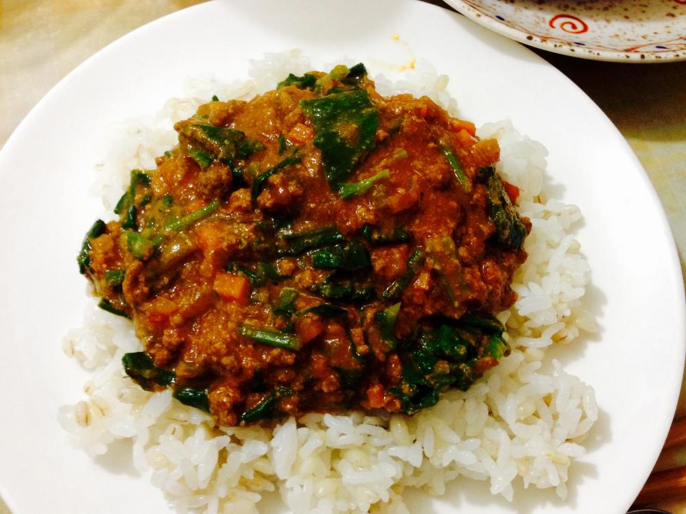 火を止めてカレールーを混ぜたら弱火で10分混ぜながら煮込む。このみでガラムマサラで辛味調整し、ほうれん草も加える。