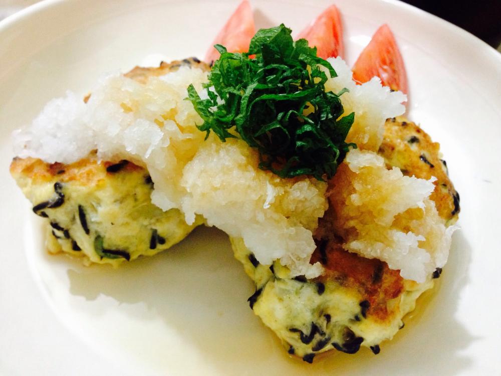 皿にハンバーグを移し、大根おろし・しそを乗せポン酢をかける。 |