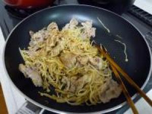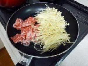 ![]() フライパンに油を引いて火にかけ、豚肉とエノキを入れて炒めます。