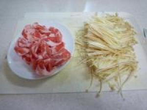 ![]() 豚肉は食べやすい大きさに切ります。エノキは石づきの部分を切り落としてほぐします。