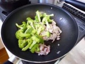 ![]() 豚肉がいたまったら、ブロッコリーを加えて炒めます。