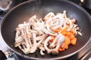 ![]() 豚バラに火が通ったら、しめじと人参も加えて炒めます。