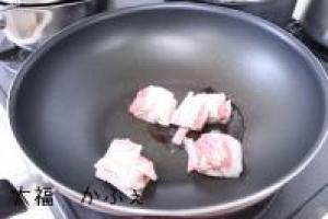 ![]() フライパンに油を引いて豚バラを炒めます。