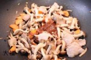 ![]() しめじと人参に火が通ったら、あわせ調味料を入れてからめ合わせます。
