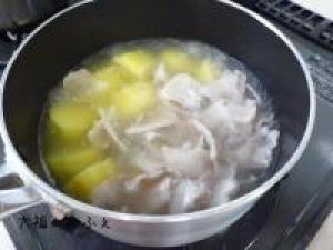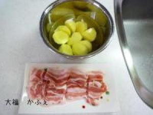 ![]() ジャガイモ(皮をむき)と豚バラ肉は一口だいに切っておきます。鍋にジャガイモと水をいれて中火にかけます。