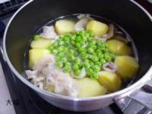 ![]() ジャガイモに火が通ったら、グリンピースを入れてもうひと煮立ちさせます。そして、最後に片栗粉でとろみをつけます。