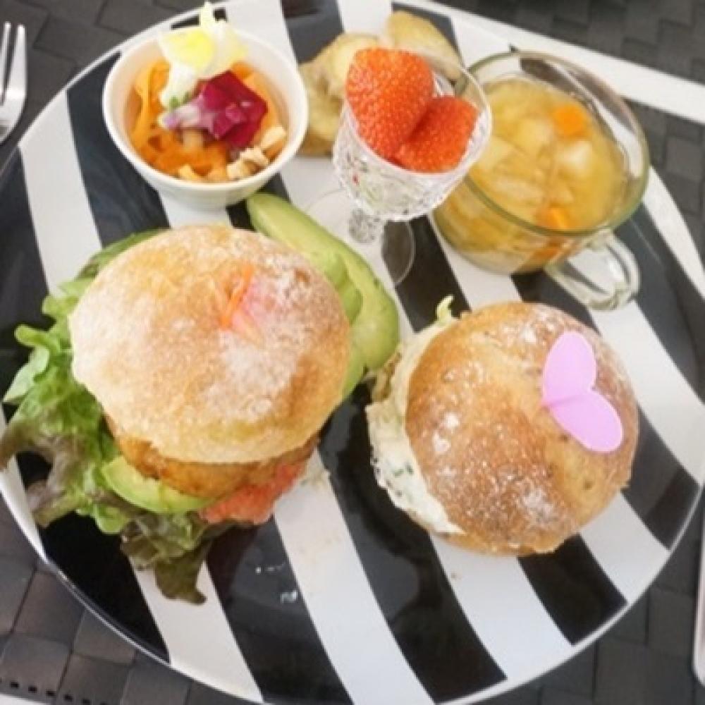 ライ麦パンを上下にカットし、パン、レタス、バーガー、トマト、アボカド、パンの順にのせたら完成です。