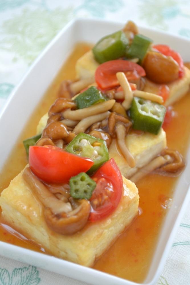 焼いた木綿豆腐をお皿に並べて、4のあんかけを上からたっぷりかければ出来上がり。