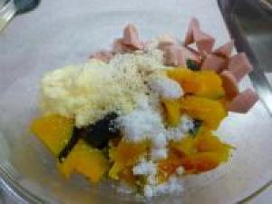 ![]() かぼちゃは、4~5分レンジにかけて柔らかくし、食べやすいい大きさに切ります。