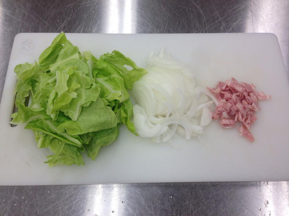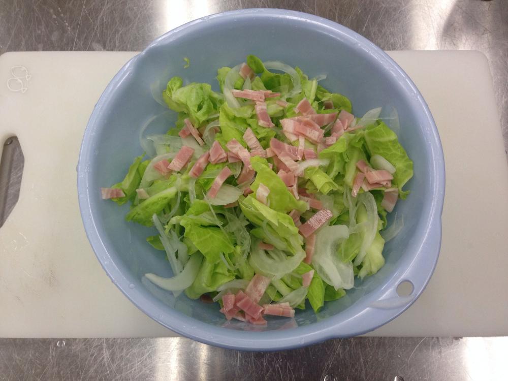 ![]() 春キャベツを一口サイズ、新玉ねぎを薄くスライス、ベーコンを細かく切ります。