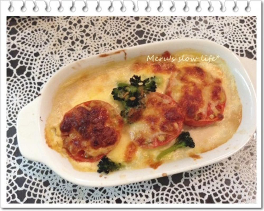 とろけるチーズを一番上にのせ、200度に余熱したオーブンで20分ほど焼いたら出来上がりです。