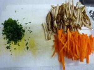 ![]() 人参は5cmほどの長さの千切りにします。ゴボウは皮をそいで5cmの千切りにして、5分ほどあく抜きします。