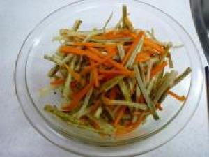 ![]() 冷めた人参、ゴボウを加えて絡め合わせたら完成です。冷蔵庫で冷やしてからお召し上がりください。