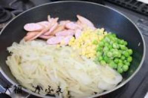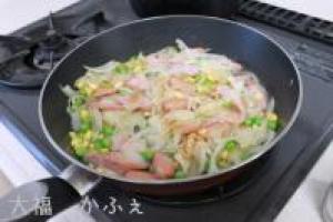 ![]() 玉ねぎがしんなりしたら、ウィンナー、コーン、グリンピースを加えてさらに炒めます。