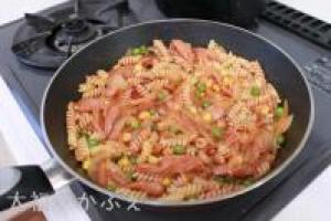 ![]() 水分が完全になくなったら、マカロニとケチャップを加えて炒め合わせます。