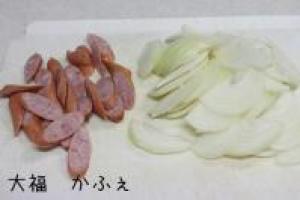 ![]() 玉ねぎは皮をむいて、薄切りにスライス。ウィンナーは斜め切りに。