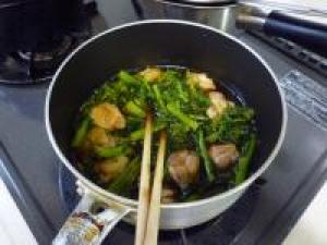 ![]() 鍋に水300cc、菜の花、鶏肉、ダシ、醤油、砂糖、料理酒を入れて煮ていきます。